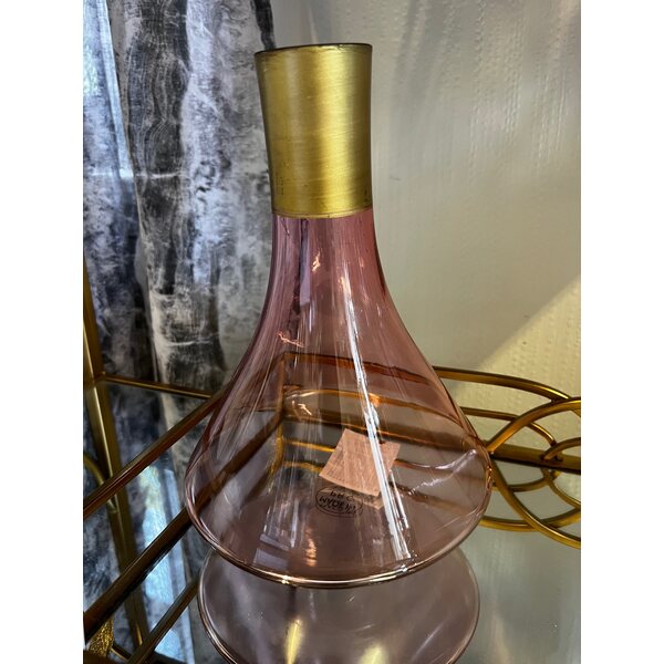 Hauska vaaleanpunainen lasinen karahvi, jossa kupera pohja. Karahvi keikkuu, mutta ei kaadu. Korkeus 23 cm. Pohjan halkaisija 15 cm.