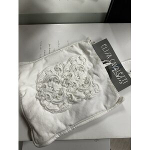 Hieno valkoinen pellavainen pussi, jonka etupuolella on koriste puuvillapitsiä.