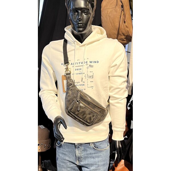 Vyölaukku, joka istuu hyvin cross bodyna. Laukku on nahkaa ja siinä on kaksi vetoketjulla suljettavaa osastoa.