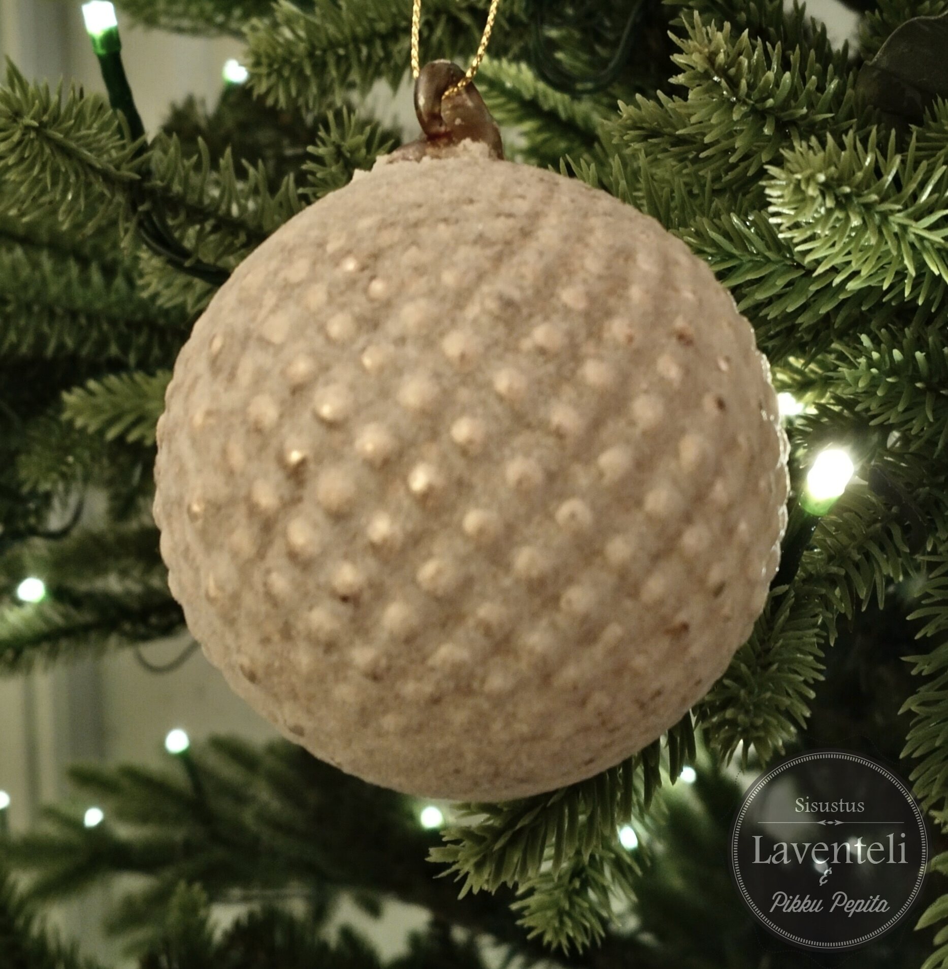 商品描述Kullanvärinen lasinen joulupallo, jossa päälle liimattu valkoista ihan pientä palloa, "pölyä".